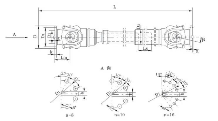 | Non. | Diamètre de giration D mm | Couple nominal tn kN · m | Axes Angle de pliage β (°) | Couple fatigué tf kN · m | Quantité flexible ls mm | Taille (mm) | Inertie rotative kg.m2 | Poids (kg) | |||||||||||